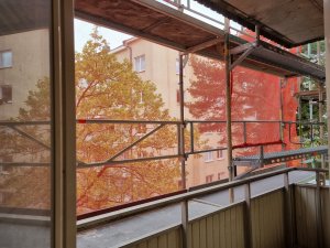 Byggnadsställning utanför min balkong. Med ”sommarväv”.